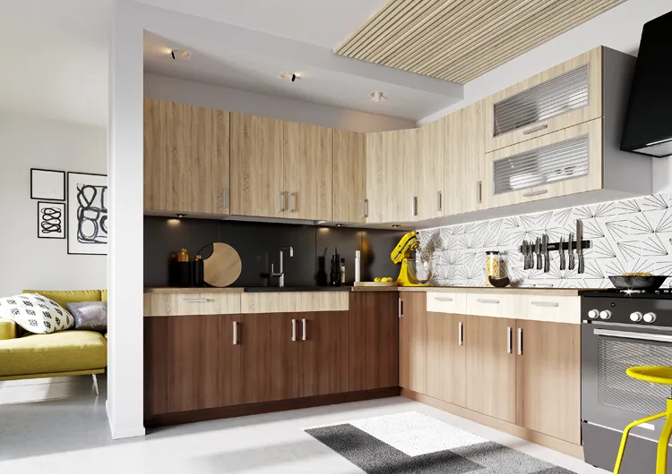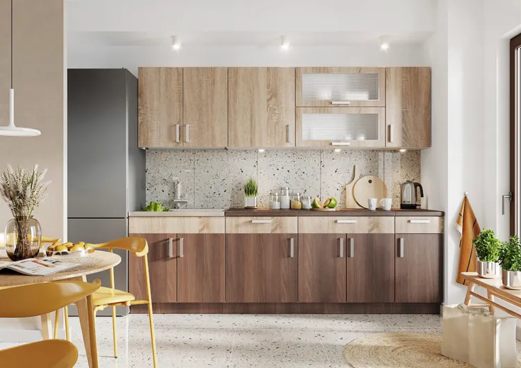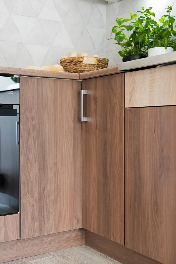 Kolekcja mebli kuchennych Abril to najnowsza propozycja designerów Elior. Kolekcja jest skierowana do osób poszukujących trwałych i praktycznych mebli w klasycznej odsłonie i ekonomicznej cenie. Abril wyróżnia się prostą formą z wybitną ergonomią oraz unikalną kolorystyką frontów w dekorze Cynamonowa akacja + dąb sonoma. Całość kolekcji to aż 19 modułowych szafek górnych i dolnych, przeznaczonych do kompleksowej aranżacji aneksów kuchennych lub niewielkich kuchni. Kompaktowe wymiary, łatwość utrzymania w czystości, ponadprzeciętna trwałość i funkcjonalizm użytkowy to tylko kilka zalet z długiej listy walorów serii Abril. Dodatkowym atutem jest możliwość skomponowania własnego zestawu, co sprawia, że  Abril jest jedną z najchętniej wybieranych kolekcji kuchennych w naszej ofercie. Poznaj kolejną propozycję z serii Abril marki Elior – górną szafkę narożną Perez 12X.