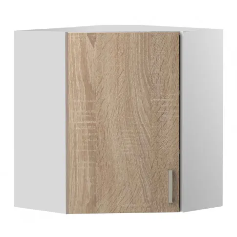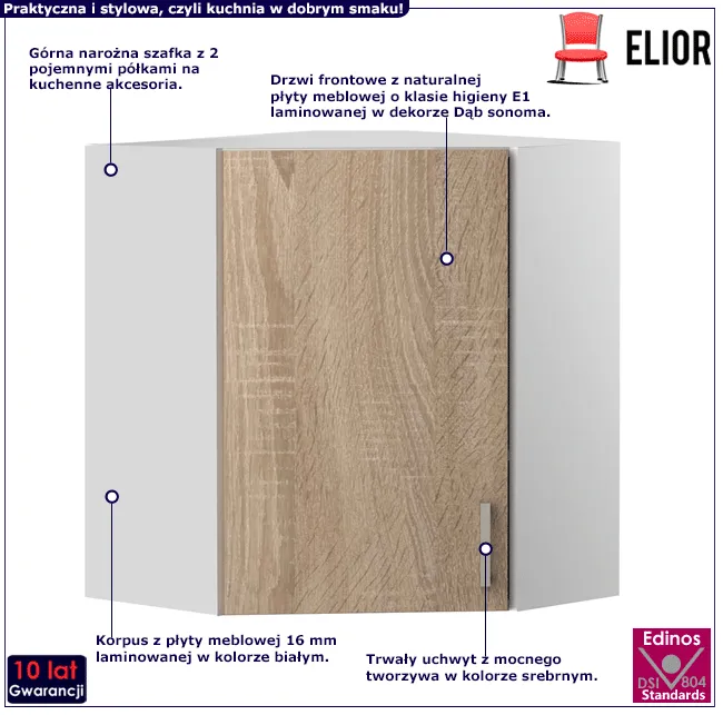 Projektowanie mebli kuchennych jest trudną sztuką. Tu, podobnie jak w sztuce kulinarnej liczy się jakość składników, precyzja i dobry smak. I tak właśnie została zaprojektowana wisząca szafka narożna Perez 12X marki Elior. Korpus oraz fronty powstały z najwyższej jakości 16 mm laminowanej płyty meblowej o klasie higieny E1. Płyta wyróżnia się ponadprzeciętną trwałością i odpornością na wilgoć i parę. Korpus w kolorze bieli został zestawiony z frontami w drewnopodobnym dekorze Dąb sonoma. Kolorystyczne detale w postaci srebrzystoszarych uchwytów podkreślają klasyczny design mebla. Za pełnymi drzwiami z możliwością montażu na prawo lub lewo kryją się 2 głębokie półki na garnki, naczynia, pojemniki z suchymi produktami spożywczymi lub mały sprzęt AGD. Tak wykonana szafka Perez 12X jest trwała, łatwa w utrzymaniu w czystości i absolutnie niezbędna w każdej kuchni. Sprawdź czym jeszcze wyróżnia się szafka Perez 12X marki Elior!