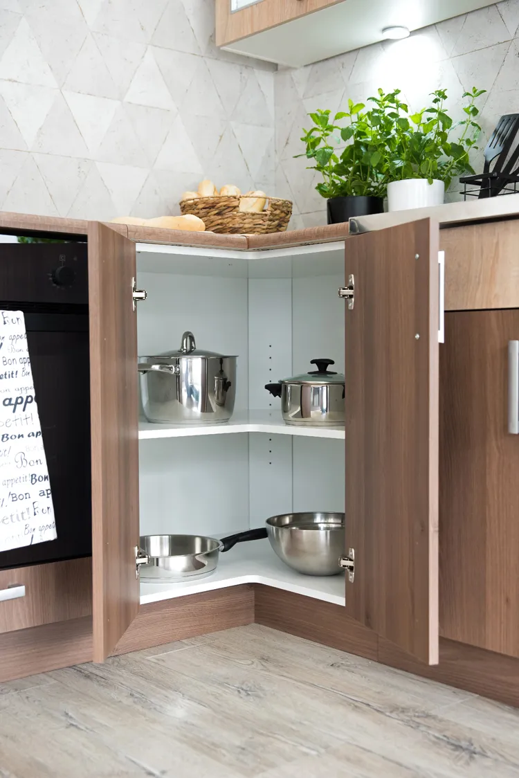 Szafka narożna Perez 12X jest częścią kolekcji Abril marki Elior przeznaczonej do aranżacji kuchni i aneksów kuchennych. Spójrz jak rewelacyjnie prezentuje się wybrany zestaw z serii Abril w przykładowej aranżacji.