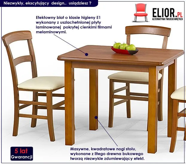 - Materiał: Wysokiej jakości płyta laminowana uszlachetniona cienkimi filmami melaminowymi. Nogi stołu wykonane są z litego drewna bukowego.