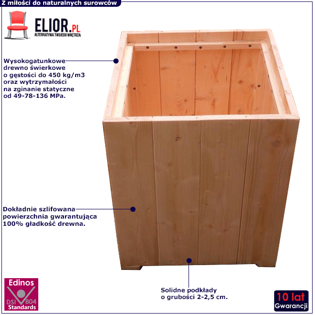 Lubisz gdy zakupiony przez Ciebie produkt wyróżnia się na tle innych pod względem jakości? Doskonale się składa. Do produkcji donicy ogrodowej Duvi wykorzystaliśmy jedynie wysokogatunkowe surowce, a całość zwieńczyliśmy precyzyjną pracą. Dzięki temu donica Duvi wyróżnia się nie tylko wyjątkową prezencją ale także niedoścignioną jakością. Drewno świerkowe z którego została wykonana donica bezpośrednio po sośnie zajmuje drugie miejsce pod względem wartości użytkowej drewna. Wyróżnia się niezwykłą trwałością oraz łatwością w obróbce. Jest lekkie i miękkie oraz posiada liczne, regularnie rozmieszczone sęki. Jego barwa jest biała, czasem z lekko żółtym odcieniem. Charakteryzuje się także wysoką gęstością do 450 kg/m3 i wytrzymałością na zginanie statyczne od 49-78-136 MPa. Donica ogrodowa Duvi to projekt który nie ma sobie równych!