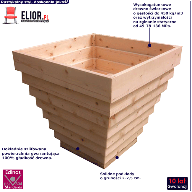 Zależy Ci na tym, aby donica którą umieścisz w swoim ogrodzie nie tylko wyróżniała się oryginalnym designem, ale także najwyższą jakością? Chciałbyś wybrać tą, która pod względem jakościowym nie ma sobie równych? Doskonale trafiłeś - donica Vanta to połączenie niepowtarzalnego stylu, wysokogatunkowych produktów oraz precyzyjnej pracy najlepszych specjalistów. Drewno świerkowe z którego została wykonana donica bezpośrednio po sośnie zajmuje drugie miejsce pod względem wartości użytkowej drewna. Wyróżnia się niezwykłą trwałością oraz łatwością w obróbce. Jest lekkie i miękkie oraz posiada liczne, regularnie rozmieszczone sęki. Jego barwa jest biała, czasem z lekko żółtym odcieniem. Charakteryzuje się także wysoką gęstością do 450 kg/m3 i wytrzymałością na zginanie statyczne od 49-78-136 MPa. Jesteśmy pewni, że dzięki wszystkim cechom, które posiada donica Vanta Twój ogród przez długi czas zaskakiwał będzie niepowtarzalną prezencją!