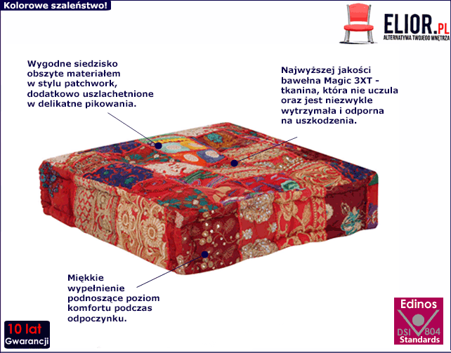 Na przestrzeni lat patchwork był różnie postrzegany jednak obecnie obserwuje się znaczne ożywienie owego stylu w meblarstwie. Objawia się on innowacyjnym wzornictwem i doskonałym wykorzystaniem nowoczesnych włókiem, kolorystyki i tkanin. Wprowadź do swojego domu odrobinę żywego akcentu wykorzystując produkty charakteryzujące się bogatym haftem i śmiałym zdobnictwem. Postaw na pufę Reo 2X, która nada szarej przestrzeni uroku i niezwykłej dekoracji. Nie bój się wyrazić swoich aranżacyjnych inspiracji, poczuj się bezpiecznie i przyjemnie w swoim domu decydując się na mebel z historią i duszą. Wprowadź do wnętrza swojego domu magiczny i awangardowy klimat. Otoczenie, w którym przebywamy ma duży wpływ na nasze samopoczucie, zatroszcz się więc o swój dobry humor dzięki różnorodnej kolorystyce poręcznego siedziska. Spraw by różnorakie fragmenty mebla pobudzały Cię do działania i z dnia na dzień wypełniały Twój dom pozytywną energią!