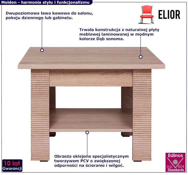Stolik kawowy Donet 11X jest częścią kolekcji Molden marki Elior przeznaczonych do aranżacji salonu, sypialni, gabinetu, pokoju młodzieżowego i przedpokoju. Sprawdź naszą ofertę i skompletuj własny zestaw mebli z kolekcji Molden marki Elior!