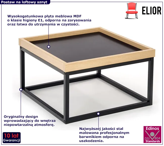 Zaprezentuj swojemu wnętrzu nowoczesny styl loftowy za pomocą naszej unikalnej ławy Usal marki Elior. Czarny blat, z eleganckim wykończeniem imitującym drewno, tworzy kontrast z metalową, czarną podstawą, nadając pomieszczeniu charakterystyczną dla stylu loftowego surowość. Kwadratowy kształt ławy sprawia, że doskonale pasuje do różnych przestrzeni – od salonu po biuro czy poczekalnię. Pozwól, aby ta ława stała się centralnym punktem Twojego wnętrza, podkreślając jego nowoczesny i loftowy charakter.
