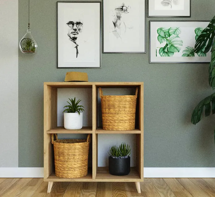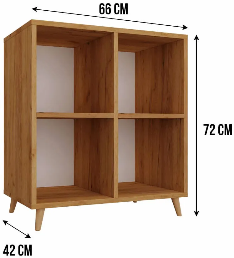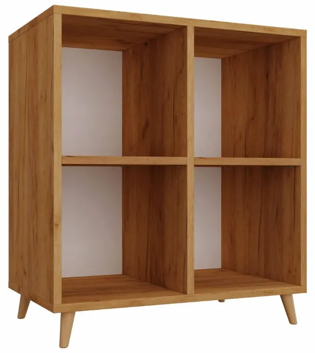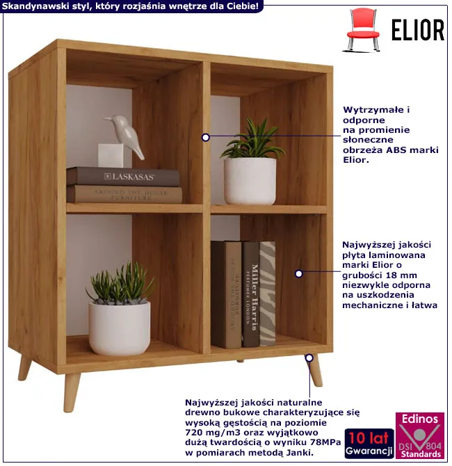 Regał Herion to kwintesencja stylu skandynawskiego. Prosty design połączony z drewnianymi nóżkami sprawia, iż ten regał kostka to świetne uzupełnienie nie tylko salonu, ale także przedpokoju, sypialni, czy pokoju młodzieżowego. Mebel podzielono na 4 pojemne przegrody, które mogą stać się miejscem na Twoje ulubione książki, pamiątki czy zdjęcia w ramkach. Ten fantastyczny regał przyciąga wzrok. Jego najważniejszą cechą jest niezwykła jakość wykonania i dbałość o każdy szczegół. Możesz być pewna, że to zakup na lata. Zaproś, więc styl skandynawski do swego wnętrza i wybierz regał Herion, który będzie jego funkcjonalną ozdobą.