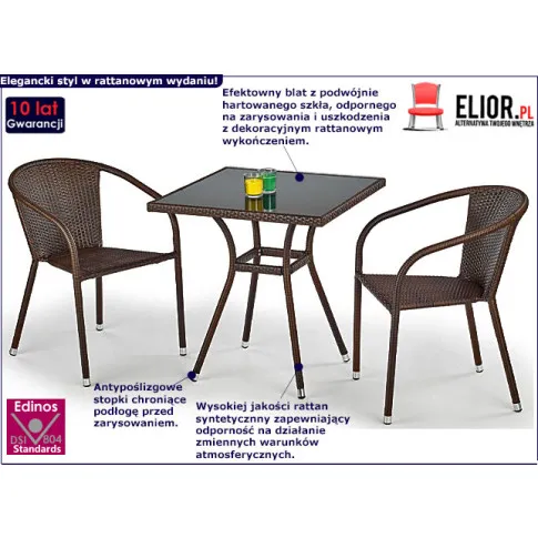 Stół Titi w całości został pokryty wspomnianym już wcześniej, niezwykle wytrzymałym rattanem syntetycznym w modnym ciemnobrązowym kolorze. Mebel prezentuje się bardzo przyjemnie, a lekkości nadaje mu połączenie szkła i rattanu syntetycznego. Stół posiada efektowny blat z podwójnie hartowanego szkła, odpornego na zarysowania i uszkodzenia mechaniczne, w niespotykanym czarnym kolorze. Warto w tym momencie zaznaczyć, że szkło uwydatni elegancki charakter Twojego tarasu, balkonu, ogrodu, salonu. Ponadto stoły ze szklanym blatem są wyjątkowo estetyczne. Ciekawa kolorystyka krzesła daje możliwość łatwego dopasowania mebla do pozostałych elementów aranżacyjnych naszego ogrodu. Dodatkowo kwadratowy kształt blatu sprawa, że zasiadający przy nim goście czują się wyjatkowo swobodnie. Zainwestuj w rozkwit życia towarzyskiego, a także w mebel, przy którym po prostu się zrelaksujesz czytając codzienną prasę i pijąc ulubioną herbatę. Ponadto rattanowe wykończenie blatu dodaje stolikowi niepowtarzalnego uroku i typowego ogrodowego klimatu! Kwadratowy blat został osadzony na czterech połączonych ze sobą nogach, które zapewniają optymalną stabilność i komfort użytkowania. A to jeszcze nie wszystko... Opisywany stolik Dione wzbogacony został w funkcjonalne, antypoślizgowe stopki, które zabezpieczą Twoją podłogę przed zarysowaniem. Warto również zaznaczyć, że najwyższa jakość materiałów pozwoliła zaoferować marce Edinos Premium aż 10 lat gwar. na swoje produkty. Jedną z największych zalet stołu ogordowego Lukka jest fakt, że utrzymanie go w czystości nie jest ani czasochłonne, ani tymbardziej pracochłonne. Codzienna pielęgnacja mebli wykonanych z rattanu syntetycznego polega na w miarę regularnym przecieraniu ich wilgotną ściereczką. Po tego typu zabiegu nie musisz ich wycierać do sucha, by ponowie zachwycały swoim unikatowym pięknem. Czego można chcieć więcej? Ten stół musi być Twój! Masz już dla niego miejsce w swojej zielonej przestrzeni?