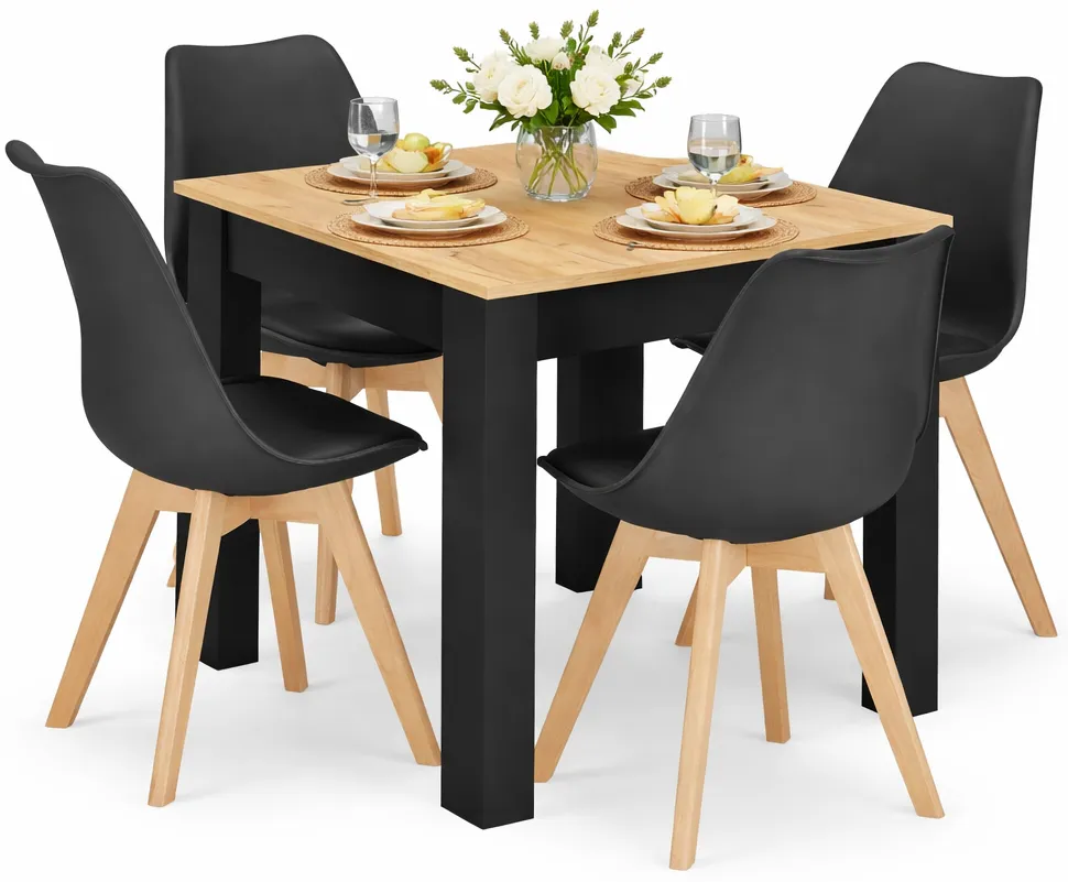 • Stół o ponadczasowym wyglądzie – kwadratowy blat w modnym wybarwieniu artisan i kontrastowe czarne nogi tworzą elegancki duet.
