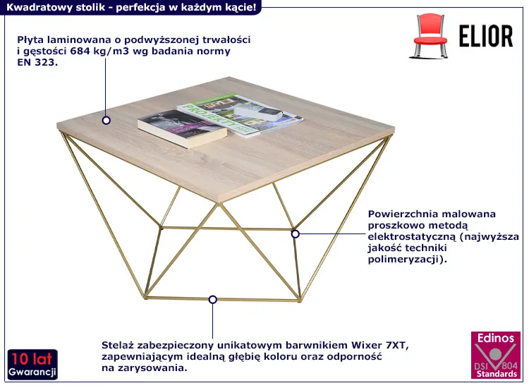 Nie czekaj. Dodaj kwadratowy stolik kawowy Mokita 4X marki Edinos Premium do swojego salonu i odkryj, jak subtelną elegancję i funkcjonalność może przynieść ten unikalny mebel. Poczuj różnicę w każdym szczególe, począwszy od trójkątnego stelaża po perfekcyjnie wykończony blat. Zadbaj o wyjątkowy styl i komfort Twojego wnętrza już dziś! Zdecyduj się już dzisiaj na zakup w rewelacyjnej cenie 318 zł.