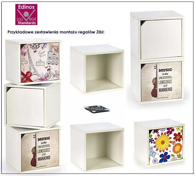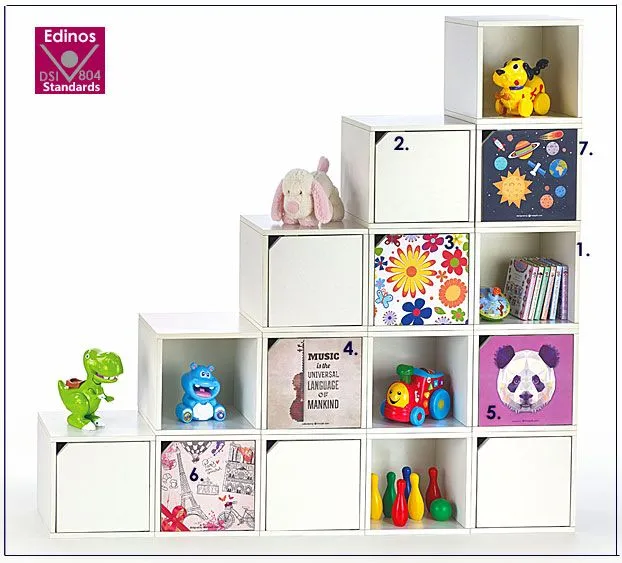 Na zdjęciu powyżej zobaczysz podgląd wszystkich regałów do wyboru: 1. Biały otwarty, 2. Biały zamknięty, 3. Kwiaty, 4. Gitara, 5. Panda, 6. Paryż, 7. Kosmos.