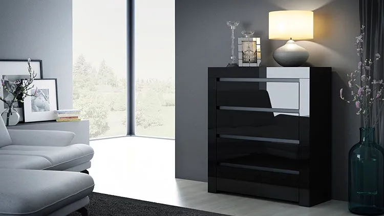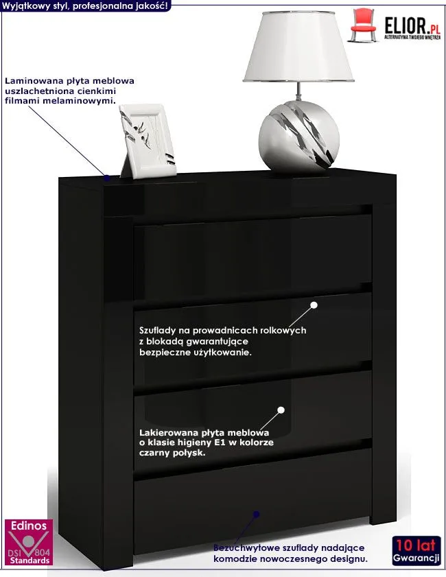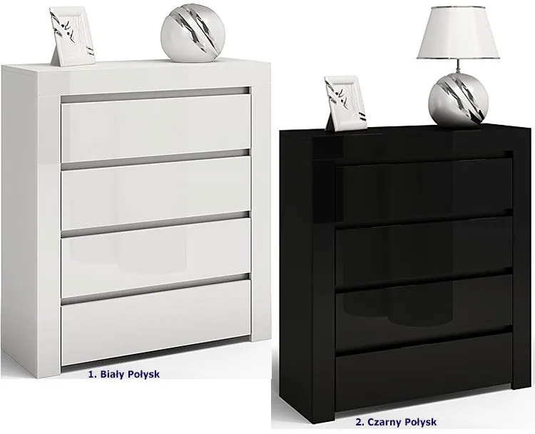 - Kolor: Fronty w kolorze czarny połysk, korpus - mat. Kliknij w link i sprawdź także inne czarne komody w sklepie Edinos.pl. Stwórz swój praktyczny zestaw mebli.