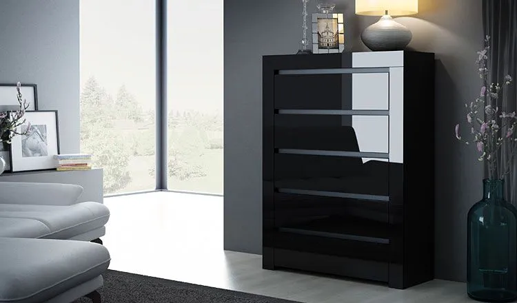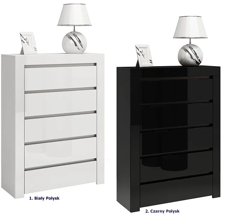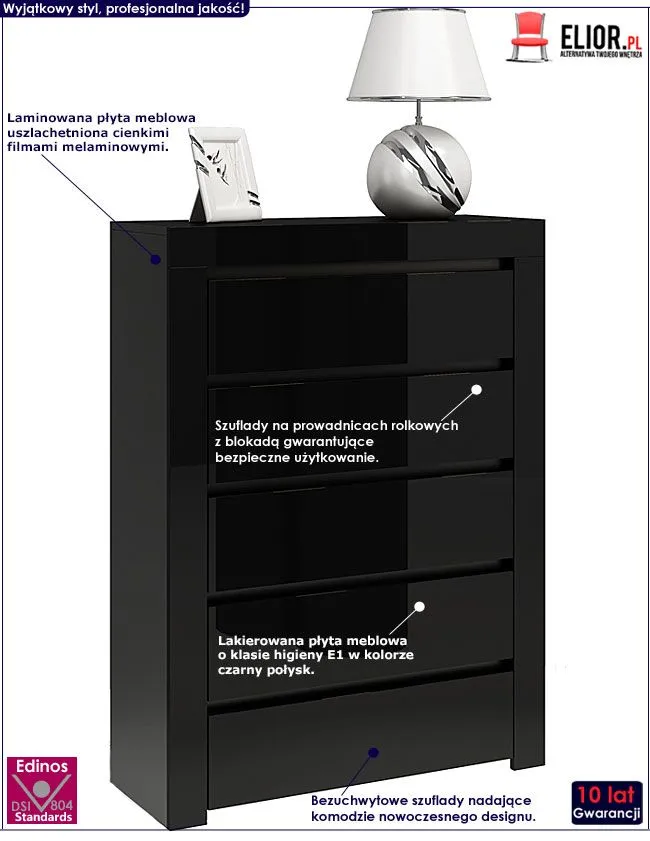 - Kolor: Fronty komody w kolorze czarny połysk, korpus - mat. Kliknij w link i sprawdź także inne czarne komody w sklepie Edinos.pl. Stwórz swój praktyczny zestaw mebli.