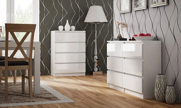 - Kolor: Fronty mebla w kolorze biały połysk, korpus - mat. Kliknij w link i sprawdź także inne białe komody w sklepie Edinos.pl. Stwórz swój praktyczny zestaw mebli.