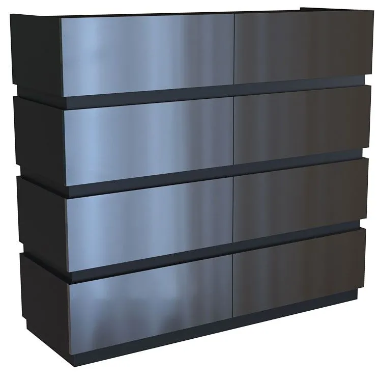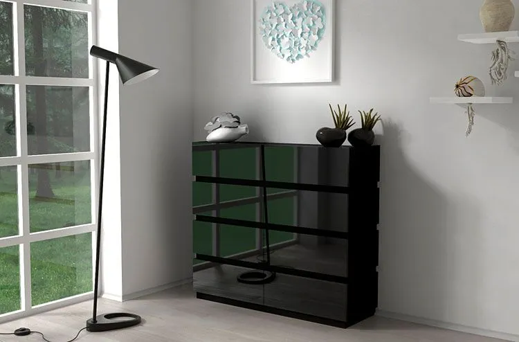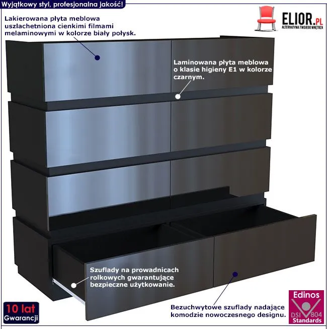 Użyta do produkcji frontów szafki lakierowana płyta meblowa w kolorze czarny połysk została uszlachetniona cienkimi filmami melaminowymi. Posiada także specjalne włókna ułożone różnokierunkowo o strukturze sinusoidalnej, co zapewnia nadanie jej cech jakościowych oraz wytrzymałościowych. Zastosowana technologia sprzyja utrzymywaniu mebla w czystości. Korpus mebla w kolorze czarnym wyprodukowano z płyty laminowanej o podwyższonej trwałości i gęstości. Dla zwiększenia wytrzymałości i trwałości mebla, obrzeża komody wykończono odpornym na uszkodzenia mechaniczne tworzywem PCV. Szuflady na prowadnicach rolkowych są gwarancją wygodnego i przede wszystkim bezpiecznego użytkowania. Bezuchwytowe fronty podkreślają nowoczesny i modernistyczny styl mebla. Osiem pojemnych szuflad jest wyjątkowo praktycznych i zapewnia komfortowe przechowywanie nie tylko ubrań czy dodatków. Stonowana kolorystyka i prosta, współczesna forma sprawiają, że szafka Nestia doskonale sprawdza się we wnętrzach urządzonych zarówno w stylu skandynawskim, jak też minimalistycznym czy nowoczesnym. Świetnie nadaje się także do wnętrz dziecięcych czy młodzieżowych. Stwórz w swoim domu niepowtarzalny i ciepły klimat z komodą marki Elior!