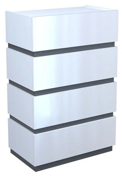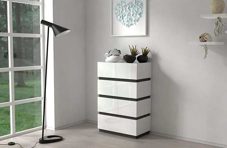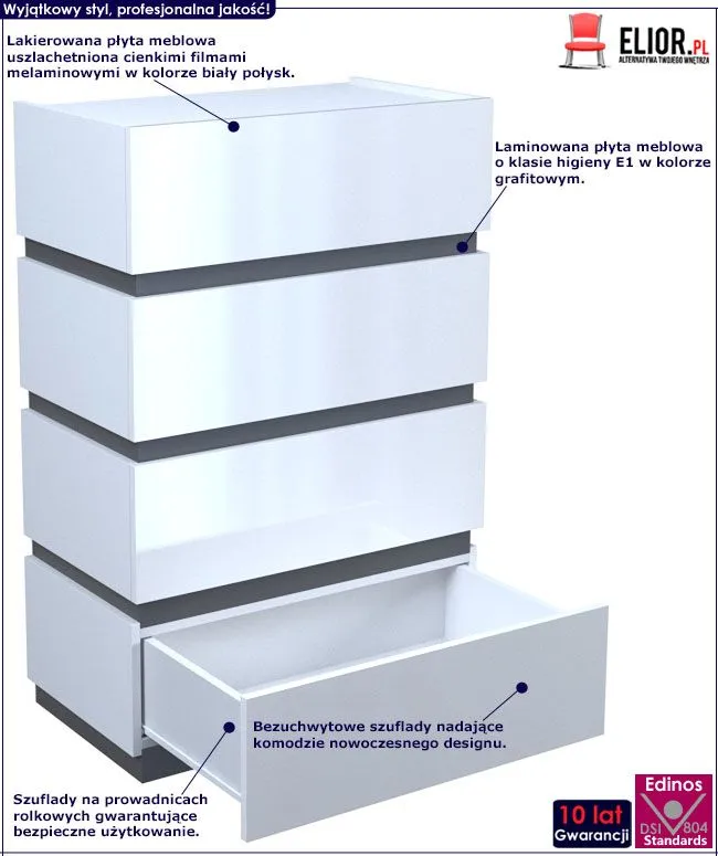 Użyta do produkcji frontów szafki lakierowana płyta meblowa w kolorze biały połysk została uszlachetniona cienkimi filmami melaminowymi. Posiada także specjalne włókna ułożone różnokierunkowo o strukturze sinusoidalnej, co zapewnia nadanie jej cech jakościowych oraz wytrzymałościowych. Zastosowana technologia sprzyja utrzymywaniu mebla w czystości. Korpus mebla w kolorze grafitowym wyprodukowano z płyty laminowanej o podwyższonej trwałości i gęstości. Dla zwiększenia wytrzymałości i trwałości mebla, obrzeża komody wykończono odpornym na uszkodzenia mechaniczne tworzywem PCV. Szuflady na prowadnicach rolkowych są gwarancją wygodnego i przede wszystkim bezpiecznego użytkowania. Bezuchwytowe fronty podkreślają nowoczesny i modernistyczny styl mebla. Cztery pojemne szuflady są wyjątkowo praktyczne i zapewniają komfortowe przechowywanie nie tylko ubrań czy dodatków. Stonowana kolorystyka i prosta, współczesna forma sprawiają, że szafka Sedia doskonale sprawdza się we wnętrzach urządzonych zarówno w stylu skandynawskim, jak też minimalistycznym czy nowoczesnym. Świetnie nadaje się także do wnętrz dziecięcych czy młodzieżowych. Stwórz w swoim domu niepowtarzalny i ciepły klimat z komodą marki Elior!