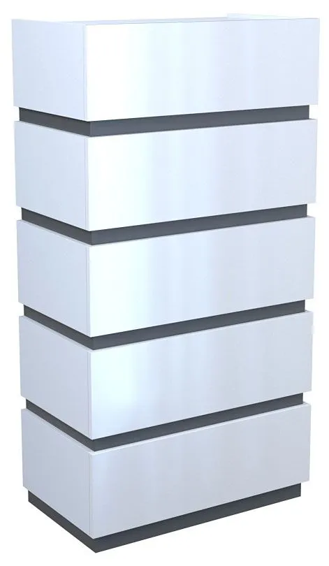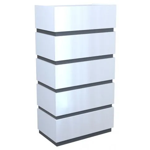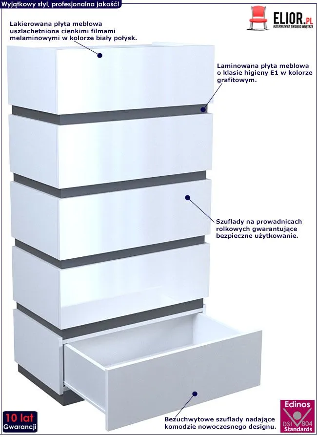 Użyta do produkcji frontów szafki lakierowana płyta meblowa w kolorze biały połysk została uszlachetniona cienkimi filmami melaminowymi. Posiada także specjalne włókna ułożone różnokierunkowo o strukturze sinusoidalnej, co zapewnia nadanie jej cech jakościowych oraz wytrzymałościowych. Zastosowana technologia sprzyja utrzymywaniu mebla w czystości. Korpus mebla w kolorze grafitowym wyprodukowano z płyty laminowanej o podwyższonej trwałości i gęstości. Dla zwiększenia wytrzymałości i trwałości mebla, obrzeża komody wykończono odpornym na uszkodzenia mechaniczne tworzywem PCV. Szuflady na prowadnicach rolkowych są gwarancją wygodnego i przede wszystkim bezpiecznego użytkowania. Bezuchwytowe fronty podkreślają nowoczesny i modernistyczny styl mebla. Pięć pojemnych szuflad jest wyjątkowo praktycznych i zapewnia komfortowe przechowywanie nie tylko ubrań czy dodatków. Stonowana kolorystyka i prosta, współczesna forma sprawiają, że szafka Sedia doskonale sprawdza się we wnętrzach urządzonych zarówno w stylu skandynawskim, jak też minimalistycznym czy nowoczesnym. Świetnie nadaje się także do wnętrz dziecięcych czy młodzieżowych. Stwórz w swoim domu niepowtarzalny i ciepły klimat z komodą marki Elior!