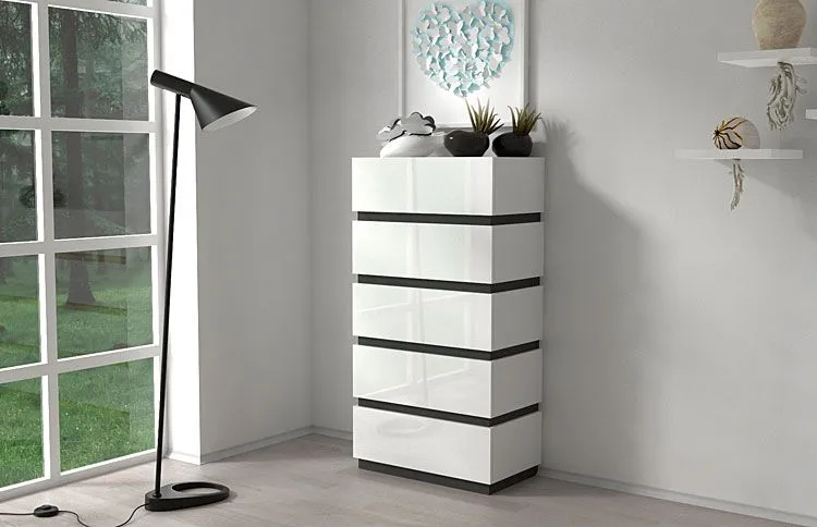 Z przyjemnością przedstawiamy Ci stylową lakierowaną komodę z 5 szufladami Toviros 7X z najnowszej, modułowej kolekcji Fandi marki Elior. To mebel charakteryzujący się wyrazistym i atrakcyjnym designem, jak również mocną oraz stabilną konstrukcją. Szafka Elior jest wyjątkowym połączeniem nowoczesnego wzornictwa z ponadczasową wygodą użytkowania.