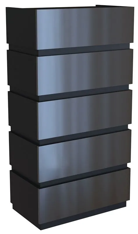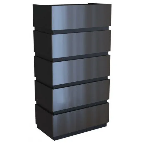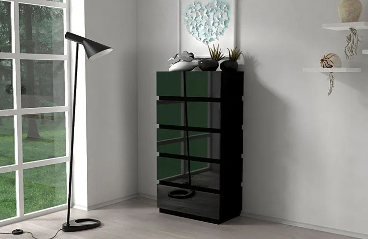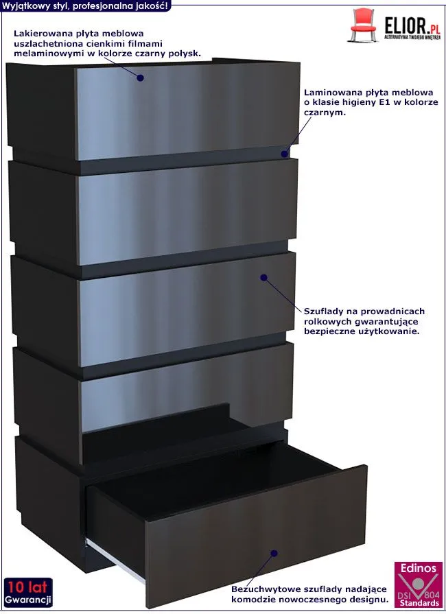 Użyta do produkcji frontów szafki lakierowana płyta meblowa w kolorze czarny połysk została uszlachetniona cienkimi filmami melaminowymi. Posiada także specjalne włókna ułożone różnokierunkowo o strukturze sinusoidalnej, co zapewnia nadanie jej cech jakościowych oraz wytrzymałościowych. Zastosowana technologia sprzyja utrzymywaniu mebla w czystości. Korpus mebla w kolorze czarnym wyprodukowano z płyty laminowanej o podwyższonej trwałości i gęstości. Dla zwiększenia wytrzymałości i trwałości mebla, obrzeża komody wykończono odpornym na uszkodzenia mechaniczne tworzywem PCV. Szuflady na prowadnicach rolkowych są gwarancją wygodnego i przede wszystkim bezpiecznego użytkowania. Bezuchwytowe fronty podkreślają nowoczesny i modernistyczny styl mebla. Pięć pojemnych szuflad jest wyjątkowo praktycznych i zapewnia komfortowe przechowywanie nie tylko ubrań czy dodatków. Stonowana kolorystyka i prosta, współczesna forma sprawiają, że szafka Sedia doskonale sprawdza się we wnętrzach urządzonych zarówno w stylu skandynawskim, jak też minimalistycznym czy nowoczesnym. Świetnie nadaje się także do wnętrz dziecięcych czy młodzieżowych. Stwórz w swoim domu niepowtarzalny i ciepły klimat z komodą marki Elior!