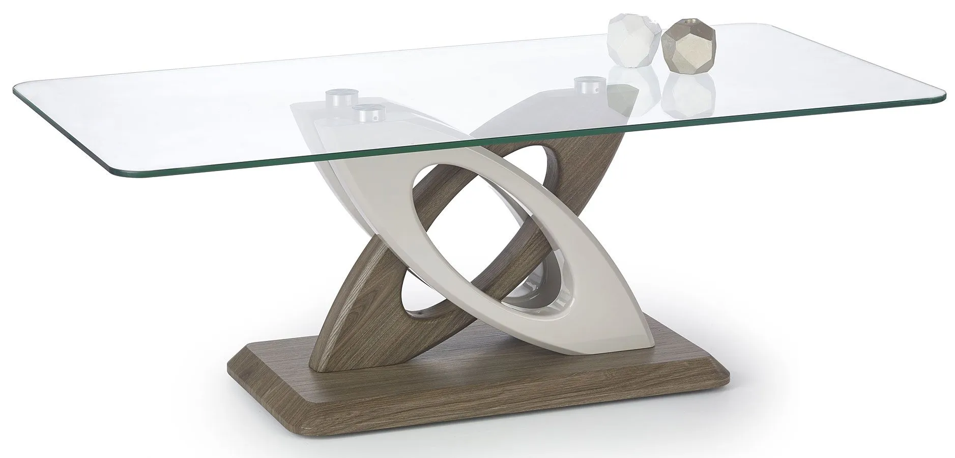 Komfortowa i oryginalna ława Rozeli wyróżnia się nie tylko swoją praktyczną formą i niebanalnym kształtem, ale także zastosowaniem materiałów najlepszej jakości. To dlatego cieszy się ona powodzeniem wśród osób wybierających nowatorskie rozwiązania. Efektowny prostokątny blat ławy wykonany został z podwójnie hartowanego szkła o grubości 9 mm, dzięki czemu jest on całkowicie odporny na rysy i uszkodzenia. Użyte do wyrobu konstrukcji mebla laminowana płyta meblowa w kolorze ciemny dąb oraz płyta lakierowana w kolorze biały połysk zostały uszlachetnione cienkimi filmami melaminowymi. Posiadają także specjalne włókna ułożone różnokierunkowo o strukturze sinusoidalnej, co zapewnia nadanie im cech jakościowych oraz wytrzymałościowych. Minimalistyczny styl i mistrzowski urok bez zbędnego przerostu formy nad treścią, pozwolą Ci w końcu odpocząć od codziennego wyścigu. Ława Rozeli dodaje wnętrzu harmonii i elegancji, a każda kawa przy niej wypita smakuje doskonale. Pozwól jej oczarować Cię swym blaskiem!