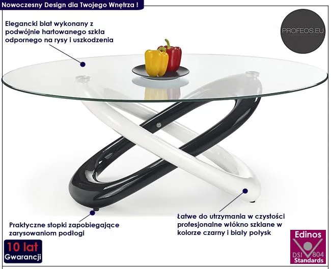 Oryginalny i elegancki stolik kawowy Epals wyróżnia się nie tylko swoją praktyczną formą i niebanalnym kształtem, ale także zastosowaniem materiałów najlepszej jakości. To dlatego cieszy się on powodzeniem wśród osób lubiących nowatorskie rozwiązania i szybko zyskał status bestsellera. Niecodzienna w formie biało-czarna konstrukcja ławy wykonana została z lakierowanego tworzywa pokrytego włóknem szklanym o średnicy 9 um. Materiał ten składa się z duroplastycznych żywic epoksydowych oraz pasm włókien ustawionych w jednym kierunku, co nadaje ławie ponadprzeciętne cechy wytrzymałościowe. Designerski blat o owalnym kształcie wykonano z podwójnie hartowanego szkła, dzięki czemu jest całkowicie odporny na rysy i uszkodzenia. Ława Epals dodaje Twemu wnętrzu światowego designu. Dzięki niej stworzysz przyjazną przestrzeń, idealną do komfortowego wypoczynku.
