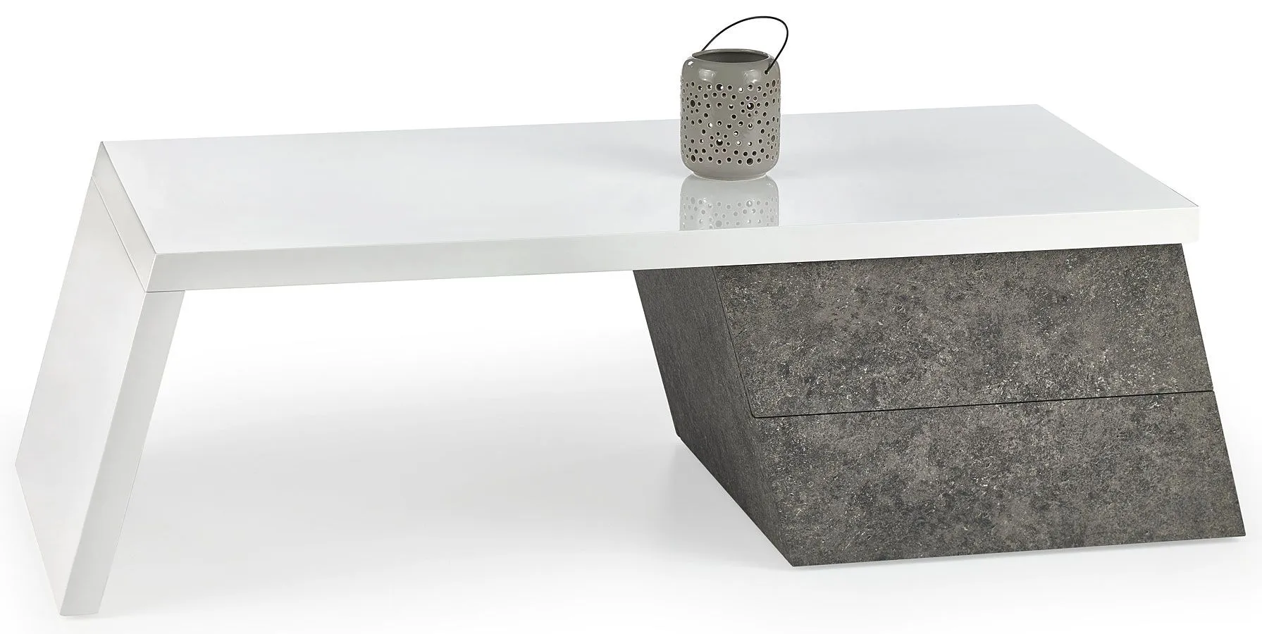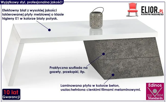 Komfortowa i efektowna ława Colins wyróżnia się nie tylko swoją niebanalną formą i praktycznym kształtem, ale także zastosowaniem materiałów najlepszej jakości. To dlatego cieszy się ona powodzeniem wśród osób wybierających nowatorskie rozwiązania. Oryginalna w formie konstrukcja ławy w kolorach beton oraz biały połysk wykonana została z laminowanej płyty meblowej o klasie higieny E1 oraz płyty lakierowanej uszlachetnionej cienkimi filmami melaminowymi. Posiadają także specjalne włókna ułożone różnokierunkowo o strukturze sinusoidalnej, co zapewnia nadanie im cech jakościowych oraz wytrzymałościowych. Mebel posiada praktyczną szufladę na drobiazgi, co pozwala Ci zaoszczędzić miejsce na blacie, a także utrzymać na nim porządek. Stonowana kolorystyka i prosta forma sprawiają, że stolik kawowy Colins doskonale sprawdza się we wnętrzach urządzonych zarówno w stylu minimalistycznym, jak też industrialnym czy nowoczesnym. Ława Elior dodaje wnętrzu harmonii i modnego designu, a każdy łyk kawy przy niej wypity pozwala Ci odetchnąć od codziennego zgiełku i pośpiechu. Nadaj Twojemu wnętrzu wyrazistego designu w ekspresyjnym, nowoczesnym stylu ze stolikiem kawowym Colins!