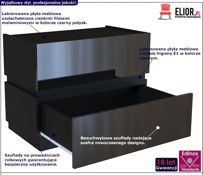 Użyta do produkcji frontów szafki lakierowana płyta meblowa w kolorze czarny połysk została uszlachetniona cienkimi filmami melaminowymi. Posiada także specjalne włókna ułożone różnokierunkowo o strukturze sinusoidalnej, co zapewnia nadanie jej cech jakościowych oraz wytrzymałościowych. Zastosowana technologia sprzyja utrzymywaniu mebla w czystości. Korpus mebla w kolorze czarnym wyprodukowano z płyty laminowanej o podwyższonej trwałości i gęstości. Dla zwiększenia wytrzymałości i trwałości mebla, obrzeża komody wykończono odpornym na uszkodzenia mechaniczne tworzywem PCV. Szuflady na prowadnicach rolkowych są gwarancją wygodnego i przede wszystkim bezpiecznego użytkowania. Bezuchwytowe fronty podkreślają nowoczesny i modernistyczny styl mebla. Dwie pojemne szuflady są wyjątkowo praktyczne i zapewniają komfortowe przechowywanie nie tylko książek czy kosmetyków. Stonowana kolorystyka i prosta, współczesna forma sprawiają, że stolik nocny Tibia doskonale sprawdza się we wnętrzach urządzonych zarówno w stylu skandynawskim, jak też minimalistycznym czy nowoczesnym. Świetnie nadaje się także do wnętrz dziecięcych czy młodzieżowych. Stwórz w swoim domu niepowtarzalny i ciepły klimat z szafką marki Elior!