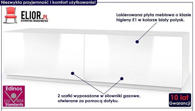 Designerska stojąca szafka RTV Vitoria 6X wyróżnia się nie tylko swoją praktyczną formą i eleganckim kształtem, ale także zastosowaniem materiałów najlepszej jakości. To dlatego cieszy się powodzeniem wśród osób lubiących nowatorskie rozwiązania. Użyta do produkcji frontów szafki lakierowana płyta meblowa w kolorze biały połysk została uszlachetniona cienkimi filmami melaminowymi. Posiada także specjalne włókna ułożone różnokierunkowo o strukturze sinusoidalnej, co zapewnia nadanie jej cech jakościowych oraz wytrzymałościowych. Zastosowana technologia sprzyja utrzymywaniu mebla w czystości. Korpus mebla w kolorze biały mat wyprodukowano z płyty laminowanej o podwyższonej trwałości i gęstości. Drzwiczki z systemem push-click (szafka nie posiada uchwytów - otwierana jest za pomocą dotyku) wyposażone w profesjonalne siłowniki gazowe gwarantują Ci niezwykle funkcjonalne korzystanie z mebla. Dwie zamykane szafki są niezwykle praktyczne i bez problemu pozwalają Ci zmieścić nie tylko kolekcję filmów. Stonowana kolorystyka i prosta forma sprawiają, że szafka pod telewizor Vitoria 6X doskonale sprawdza się we wnętrzach urządzonych w stylu minimalistycznym czy nowoczesnym. Nadaj Twojemu wnętrzu wyrazistego designu, harmonizując go z czystością prawdziwej bieli!
