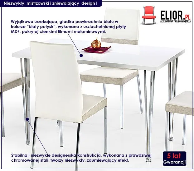 Stół to centralny mebel Twojego wnętrza. Mogą dziać się przy nim rzeczy piękne, czarodziejskie i fascynujące. Niestety Twój stół usłyszy kiedyś także inne reakcje emocjonalne jak chociażby gniew, przygnębienie czy rozdrażnienie. Zadbaj więc o to, aby ten najważniejszy mebel Twojego domu, godnie znosił wszystkie panujące u Ciebie myśli, nastroje i emocje. Postaw na profesjonalny produkt znanego producenta, który jako jedyny na rynku oferuję Ci aż 5 lat gwarancji i niebywale ekscytujący design. Zakochasz się w nim od pierwszego wejrzenia.