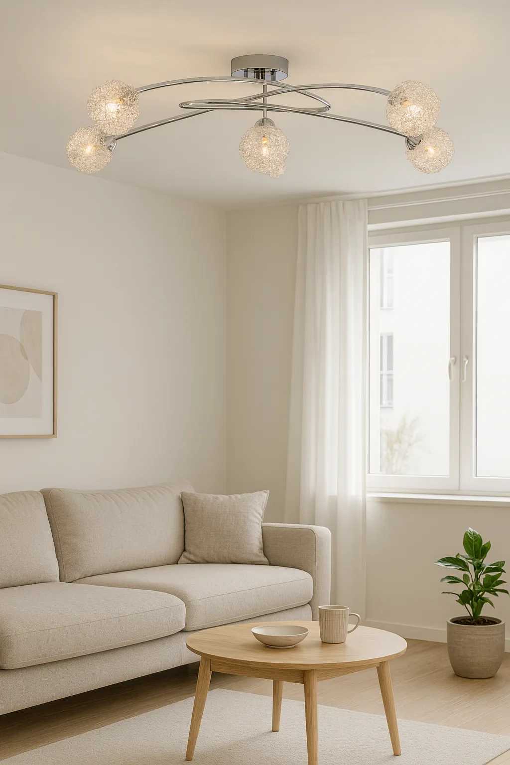 Lampa została wyposażona w pięć kulistych kloszy, które równomiernie rozpraszają światło i nadają wnętrzu efektowny blask. Jej ozdobne wykończenie w postaci siatki z drobnych drucików dodaje całości designerskiego charakteru i sprawia, że trudno przejść obok niej obojętnie. Nowoczesna forma doskonale komponuje się z wnętrzami urządzonymi w stylu loft, glamour czy minimalistycznym, dzięki czemu lampa z łatwością odnajdzie się w różnorodnych aranżacjach. Jej konstrukcja pozwala stworzyć wyrazisty punkt centralny w salonie lub jadalni, przyciągając uwagę i budując nastrój. Co ważne, prosty montaż sprawia, że w krótkim czasie możesz wprowadzić do swojego domu zupełnie nowy klimat.