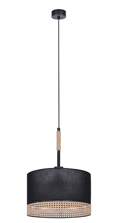 Dekoracyjna lampa S906-Egrof cechuje się nowoczesnym designem z elementami stylu rustykalnego i boho. Nawiązuje do nich abażur, który składa się z czarnej, wyrazistej tkaniny oraz przepięknego rattanu. Niepowtarzalnego klimatu dodaje także jutowy sznurek, który tak bardzo wpisuje się w nowoczesne trendy wnętrzarskie - boho chic oraz urban jungle. Lampa niesamowicie zaprezentuje się na tle bogatej roślinności, orientalnych wzorów i przestrzeni pełnych artyzmu. Dzięki regulowanej wysokości dopasujesz jej długość do własnych potrzeb, wieszając ją na przykład nad stołem lub wyspą kuchenną.