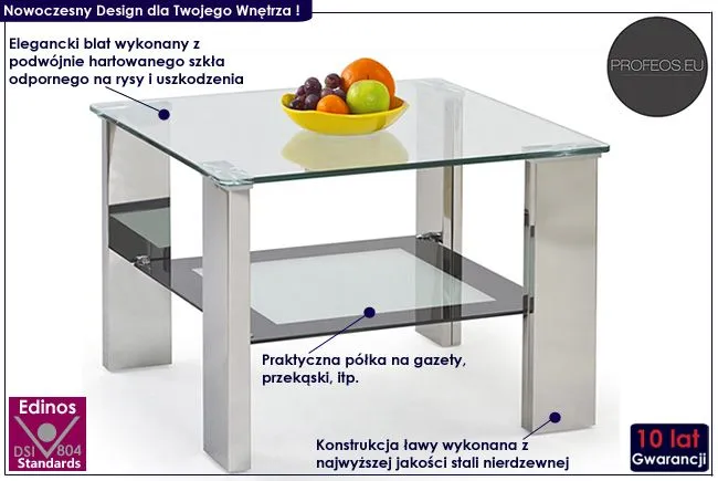 Efektowny i komfortowy stolik kawowy Arreta 2X wyróżnia się nie tylko swoją praktyczną formą i eleganckim kształtem, ale także zastosowaniem materiałów najlepszej jakości. To dlatego cieszy się on powodzeniem wśród osób lubiących nowatorskie rozwiązania i szybko zyskał status bestsellera. Konstrukcja stolika wykonana została z najwyższej jakości stali nierdzewnej, co gwarantuje jej niezwykły efekt wizualny, posiadając przy tym ponadprzeciętne cechy antykorozyjne. Designerski blat o kwadratowym kształcie wyprodukowano z podwójnie hartowanego szkła, dzięki czemu jest całkowicie odporny na rysy i uszkodzenia, a także łatwy w czyszczeniu. Praktyczna półka na niezbędne dokumenty czy inne drobiazgi w kolorze mleczno-czarnym pomaga Ci zaoszczędzić miejsce na stole, a także utrzymać na nim porządek. Ława Arreta 2X dodaje Twemu wnętrzu nowoczesności i elegancji. Nie trać pieniędzy na chińskie, wątpliwej jakości meble. Zainwestuj w swoją wygodę i dobry smak.
