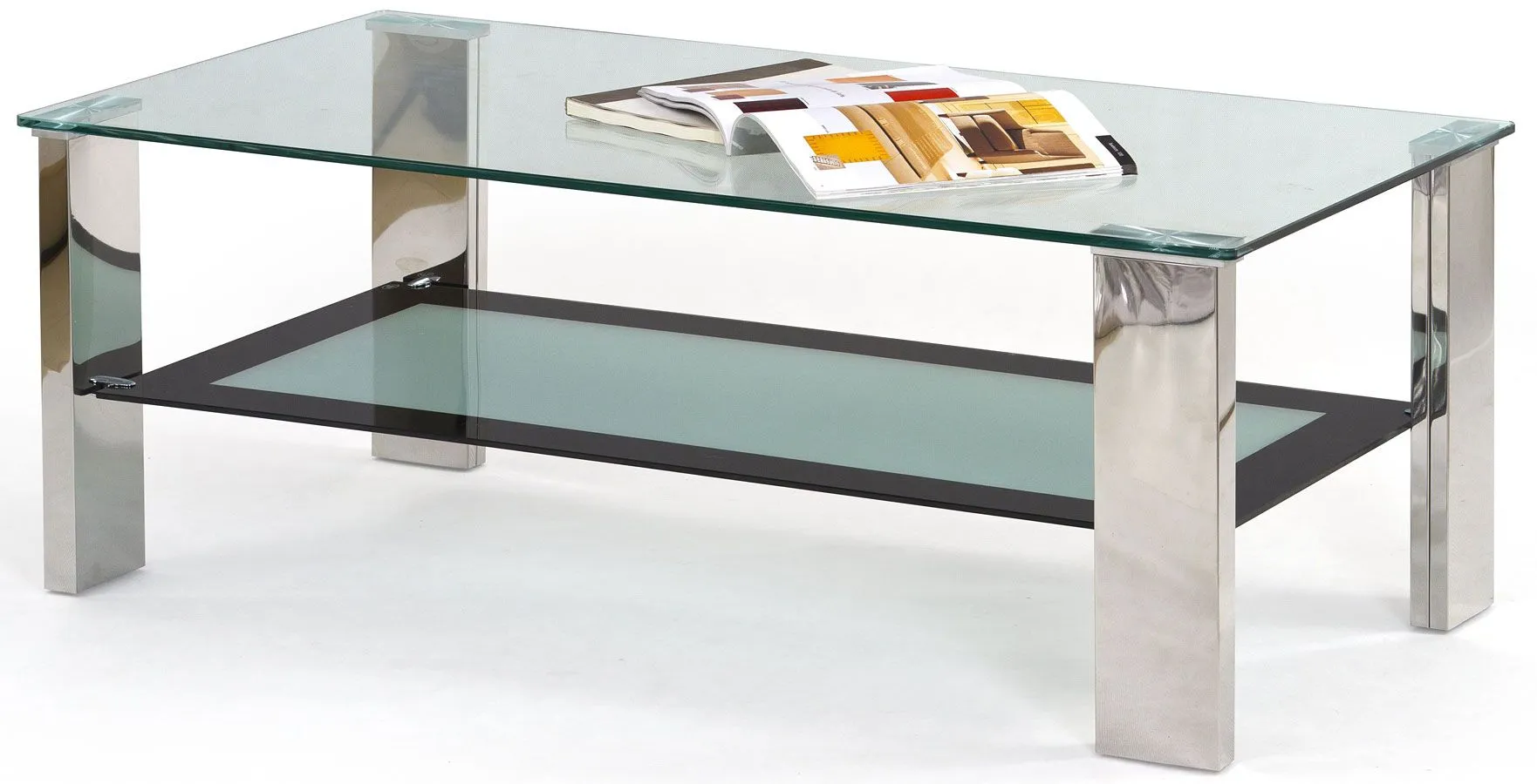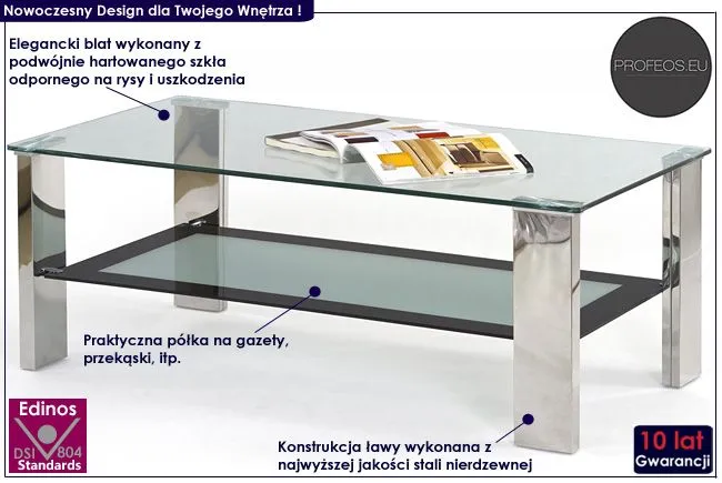 Efektowny i komfortowy stolik kawowy Arreta 3X wyróżnia się nie tylko swoją praktyczną formą i eleganckim kształtem, ale także zastosowaniem materiałów najlepszej jakości. To dlatego cieszy się on powodzeniem wśród osób lubiących nowatorskie rozwiązania i szybko zyskał status bestsellera. Konstrukcja stolika wykonana została z najwyższej jakości stali nierdzewnej, co gwarantuje jej niezwykły efekt wizualny, posiadając przy tym ponadprzeciętne cechy antykorozyjne. Designerski blat o prostokątnym kształcie wyprodukowano z podwójnie hartowanego szkła, dzięki czemu jest całkowicie odporny na rysy i uszkodzenia, a także łatwy w czyszczeniu. Praktyczna półka na niezbędne dokumenty czy inne drobiazgi w kolorze mleczno-czarnym pomaga Ci zaoszczędzić miejsce na stole, a także utrzymać na nim porządek. Ława Arreta 3X dodaje Twemu wnętrzu nowoczesności i elegancji. Nie trać pieniędzy na chińskie, wątpliwej jakości meble. Zainwestuj w swoją wygodę i dobry smak.