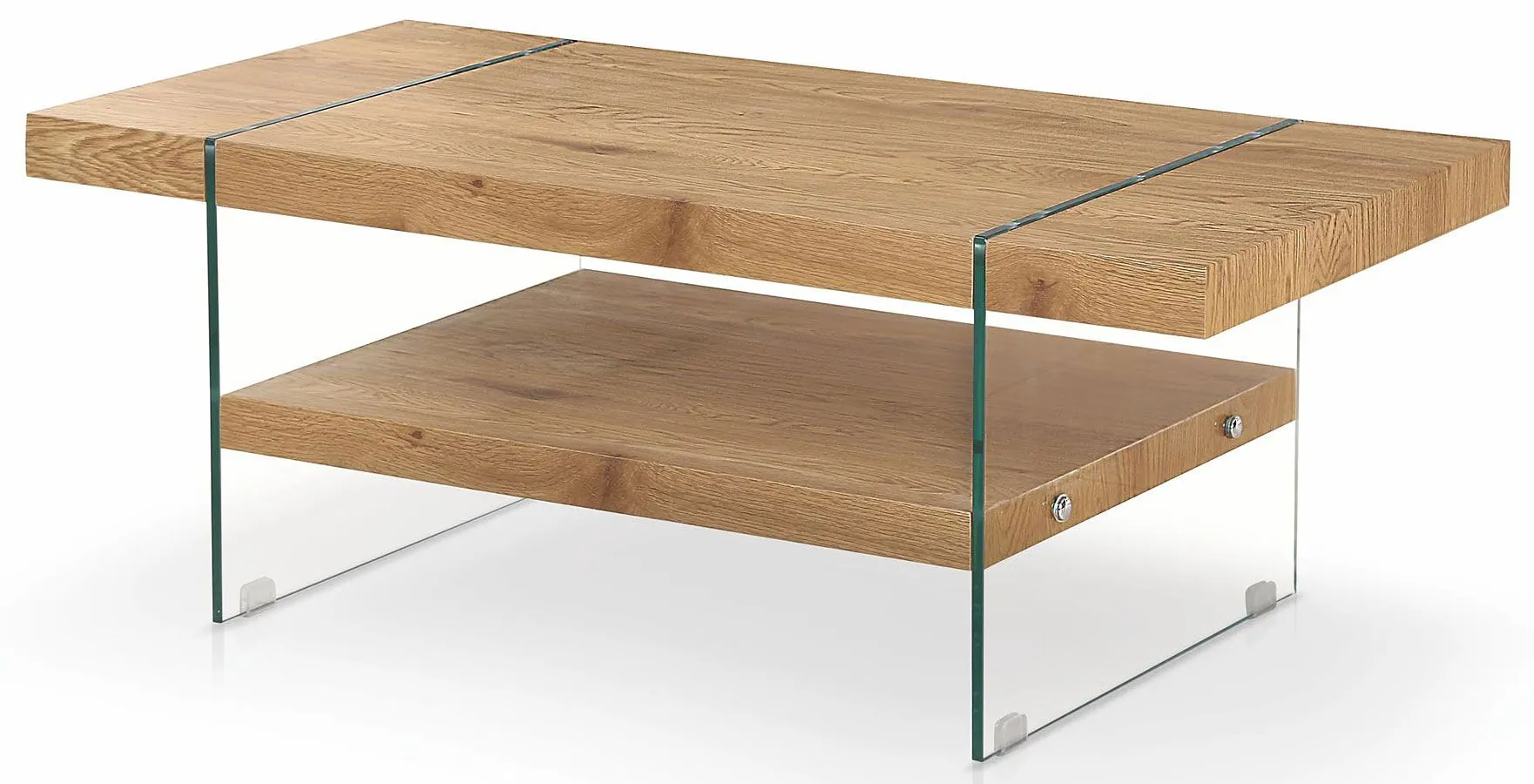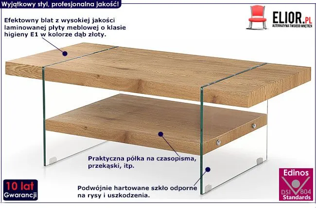 Komfortowa i efektowna ława Ernest wyróżnia się nie tylko swoją niebanalną formą i praktycznym kształtem, ale także profesjonalnym wykonaniem. To dlatego cieszy się ona powodzeniem wśród osób wybierających niebanalne rozwiązania. Oryginalną w formie konstrukcję stolika wyprodukowano z podwójnie hartowanego szkła, dzięki czemu jest całkowicie odporna na rysy i uszkodzenia, a także łatwa w czyszczeniu. Oba blaty w nowoczesnym kolorze dąb złoty wykonane zostały z najwyższej jakości laminowanej płyty meblowej o klasie higieny E1, uszlachetnionej cienkimi filmami melaminowymi. Posiada także specjalne włókna ułożone różnokierunkowo o strukturze sinusoidalnej, co zapewnia nadanie jej cech jakościowych oraz wytrzymałościowych. Duża półka na prasę czy przekąski jest niezwykle praktyczna i pomaga Ci zaoszczędzić miejsce na blacie głównym, a także utrzymać na nim porządek. Stonowana kolorystyka i prosta, współczesna forma sprawiają, że stolik kawowy Ernest doskonale sprawdza się we wnętrzach urządzonych zarówno w stylu nowoczesnym, jak też minimalistycznym czy industrialnym (loftowym). Ława Elior nadaje wnętrzu harmonii i modnego charakteru, a każdy łyk kawy przy niej wypity pozwala Ci odetchnąć od codziennego zgiełku i pośpiechu. Nadaj Twojemu wnętrzu wyrazistego designu, harmonizując go ze świeżością naturalnych barw!