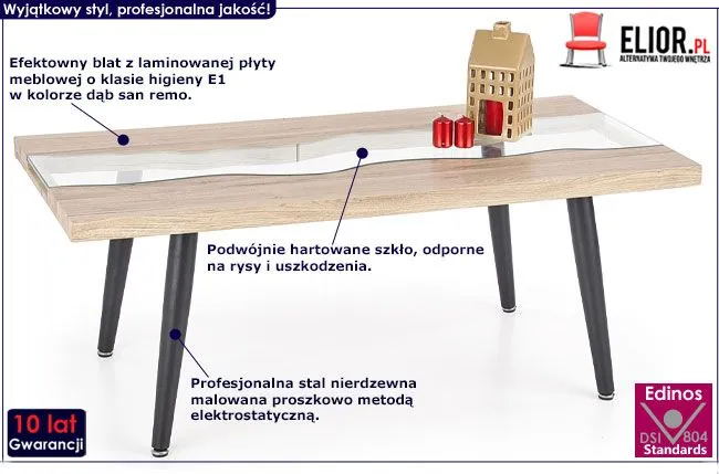 Komfortowa i oryginalnie zaprojektowana ława Okis wyróżnia się nie tylko swoją niebanalną formą i praktycznym kształtem, ale także wykorzystaniem materiałów najlepszej jakości. Czarną konstrukcję stolika wyprodukowano z najlepszej gatunkowo nierdzewnej stali malowanej proszkowo odpornym na zarysowania i zadrapania. Najwyższa jakość techniki polimeryzacji pozwoliła zaoferować firmie Elior aż 10 lat gwarancji na swoje produkty. Już nie musisz się martwić, że po kilku latach część farby odpryśnie od mebla . Designerski blat stworzono efektownie łącząc podwójnie hartowane szkło z laminowaną płytą meblową w kolorze dąb san remo. Najwyższej jakości laminowana płyta o klasie higieny E1 uszlachetniona została cienkimi filmami melaminowymi. Posiada także specjalne włókna ułożone różnokierunkowo o strukturze sinusoidalnej, co zapewnia nadanie jej cech jakościowych oraz wytrzymałościowych. Stonowana kolorystyka i prosta, współczesna forma sprawiają, że stolik kawowy Okis doskonale sprawdza się we wnętrzach urządzonych zarówno w stylu nowoczesnym, jak też minimalistycznym czy industrialnym (loftowym). Ława Elior nadaje wnętrzu harmonii i modnego charakteru, a każdy łyk kawy przy niej wypity pozwala Ci odetchnąć od codziennego zgiełku i pośpiechu. Nadaj Twojemu wnętrzu wyrazistego designu ze stolikiem Okis!
