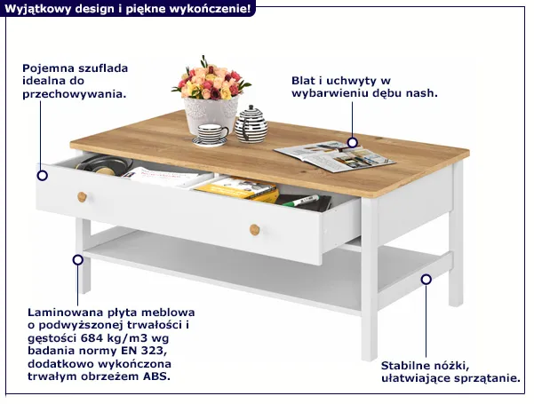 • Modna kolorystyka: biały mat + dąb nash. Kliknij w link i sprawdź także inne ławy i stoliki kawowe w stylu skandynawskim w sklepie Edinos.pl. Stwórz swój praktyczny zestaw mebli.