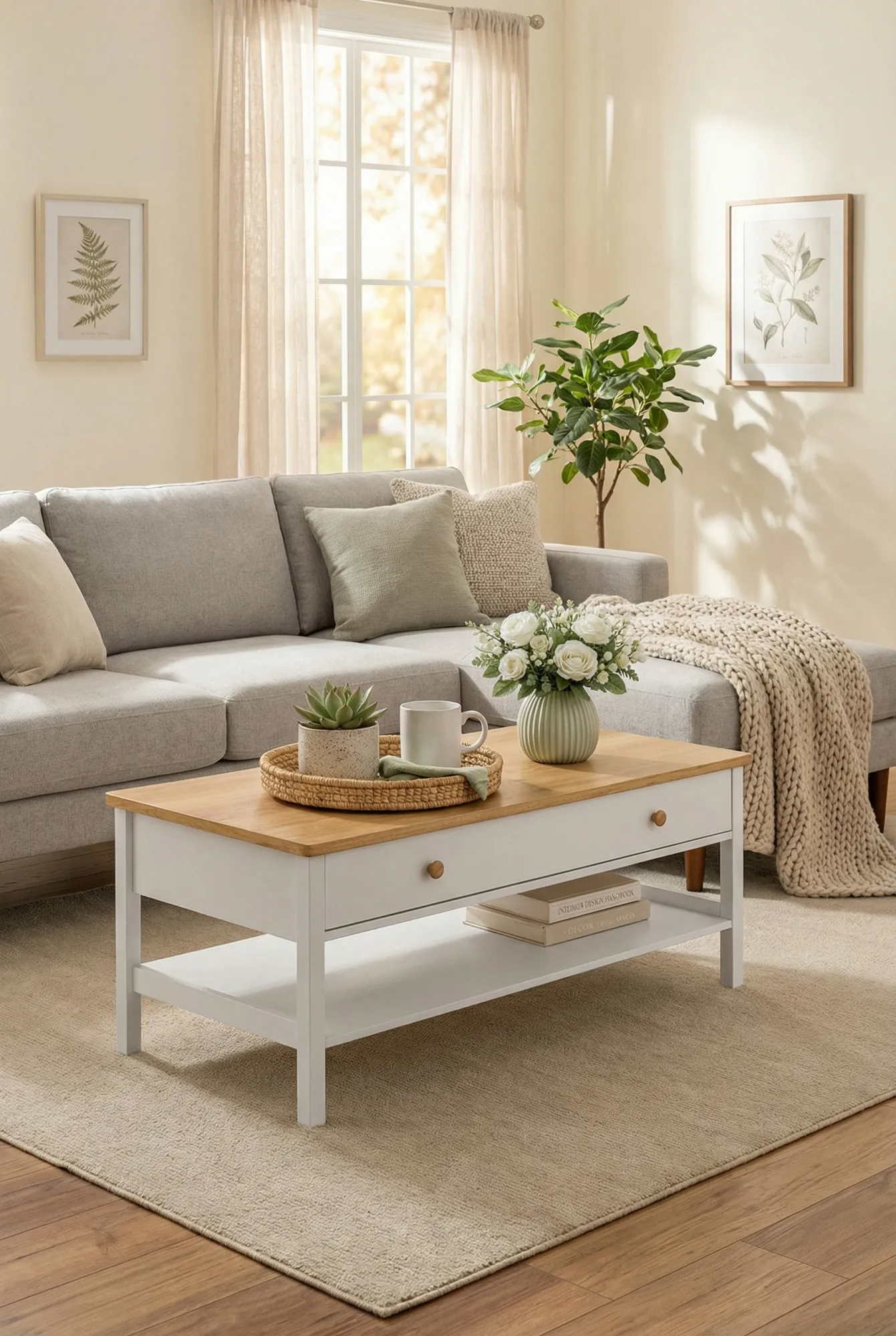 Ma prostą formę i uniwersalną kolorystykę, która pasuje do wielu wnętrz. Szuflada jest przydatna, choć jej pojemność jest raczej standardowa. Półka pod blatem dobrze sprawdza się na drobiazgi. Całość prezentuje się schludnie i stanowi funkcjonalny element salonu.