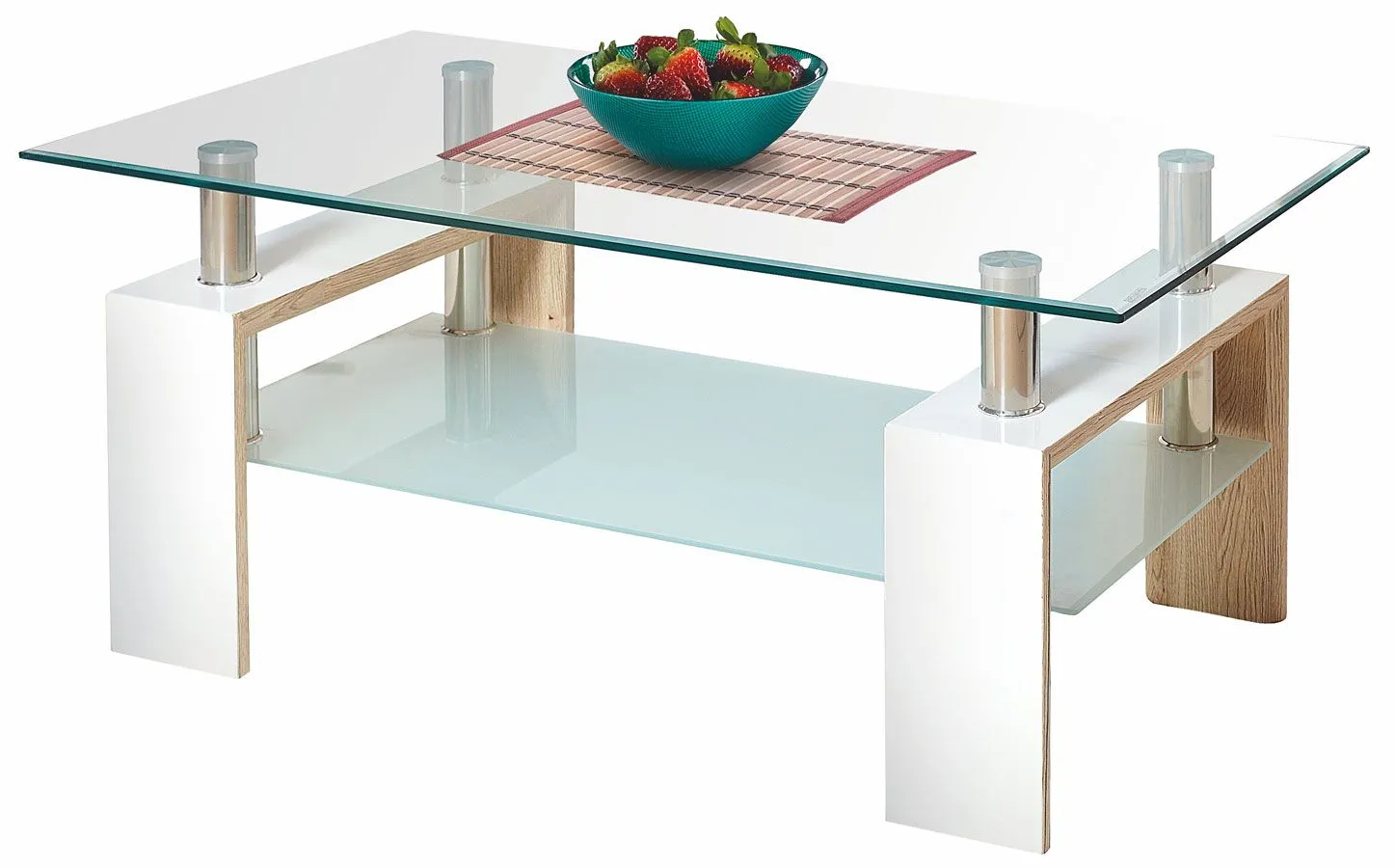 - Materiał: Wysokiej jakości lakierowana płyta MDF oraz płyta laminowana uszlachetniona cienkimi filmami melaminowymi. Blat wykonany został ze specjalnie hartowanego szkła (dokładnie szlifowanego i polerowanego na obrzeżach).