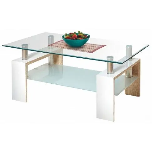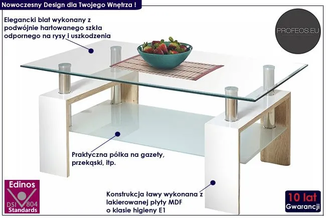 Efektowny i komfortowy stolik kawowy Adler wyróżnia się nie tylko swoją praktyczną formą i eleganckim kształtem, ale także zastosowaniem materiałów najlepszej jakości. To dlatego cieszy się on powodzeniem wśród osób lubiących nowatorskie rozwiązania i szybko zyskał status bestsellera. Praktyczna w formie konstrukcja ławy wykonana została z wysokiej jakości lakierowanej płyty MDF w kolorze biały połysk oraz płyty laminowanej w kolorze dąb sonoma, uszlachetnionej cienkimi filmami melaminowymi. Posiada także specjalne włókna ułożone różnokierunkowo, co zapewnia jej nadanie cech jakościowych oraz wytrzymałościowych. Designerski blat o prostokątnym kształcie wyprodukowano z podwójnie hartowanego szkła, dzięki czemu jest całkowicie odporny na rysy i uszkodzenia, a także łatwy w czyszczeniu. Duża półka na niezbędne dokumenty czy inne drobiazgi jest niezwykle praktyczna i pomaga Ci zaoszczędzić miejsce na stole, a także utrzymać na nim porządek. Ława Adler dodaje Twemu wnętrzu nowoczesności i elegancji. Nie trać pieniędzy na chińskie, wątpliwej jakości meble. Zainwestuj w swoją wygodę i dobry smak.