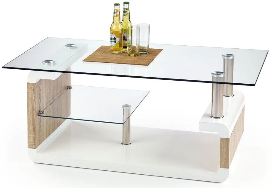 Komfortowa i wykwintna ława Enigma wyróżnia się nie tylko swoją praktyczną formą i eleganckim kształtem, ale także zastosowaniem materiałów najlepszej jakości. To dlatego cieszy się ona powodzeniem wśród osób lubiących nowatorskie rozwiązania. Użyta do produkcji ścianek mebla płyta laminowana w kolorze dąb sonoma została uszlachetniona cienkimi filmami melaminowymi. Posiada także specjalne włókna ułożone różnokierunkowo, co zapewnia nadanie jej cech jakościowych oraz wytrzymałościowych. Podstawa stolika wyprodukowana została z lakierowanej płyty MDF w kolorze biały połysk. Designerski prostokątny blat stworzono z podwójnie hartowanego szkła, dzięki czemu jest całkowicie odporny na rysy i uszkodzenia. Praktyczna półka na niezbędne drobiazgi pomaga Ci zaoszczędzić miejsce na blacie i utrzymać na nim porządek. Ława Enigma dodaje wnętrzu harmonii i elegancji, a każda kawa przy niej wypita smakuje doskonale. Podaruj Twoim czterem kątom nieco naturalnego ciepła, harmonizując je z czystością kolorów ziemi.