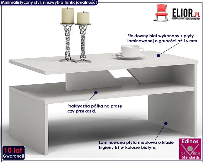 Przedstawiamy Ci zachwycający stolik kawowy Infermi z kolekcji Martis marki Elior. To doskonała propozycja dla osób ceniących piękno w swoim wnętrzu. Ława wykonana została z laminowanej płyty meblowej o klasie higieny E1, uszlachetnionej cienkimi filmami melaminowymi. Posiada także specjalne włókna ułożone różnokierunkowo o strukturze sinusoidalnej, co zapewnia nadanie jej cech jakościowych oraz wytrzymałościowych. Prostokątny blat o grubości aż 16 mm wyprodukowano z płyty laminowanej o podwyższonej trwałości i gęstości. Duża półka na prasę czy przekąski jest niezwykle praktyczna i pomaga Ci zaoszczędzić miejsce na blacie głównym, a także utrzymać na nim porządek. Stonowana kolorystyka i prosta forma sprawiają, że stolik Infermi doskonale sprawdza się we wnętrzach urządzonych w stylu skandynawskim, jak też minimalistycznym czy nowoczesnym. Świetnie nadaje się także do wnętrz dziecięcych czy młodzieżowych. Stwórz w swoim domu niepowtarzalny i ciepły klimat z ławą marki Elior!