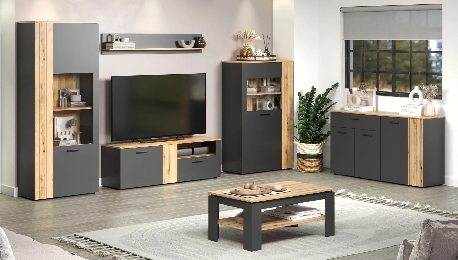 Kolekcja Assoni marki Edinos Premium to propozycja dla miłośników naturalnego designu z nutą nowoczesności. Frezowane ryfle, eleganckie połączenie dębu evok z grafitem oraz funkcjonalne blaty tworzą spójny zestaw mebli do salonu, jadalni czy sypialni. Każdy element kolekcji zachwyca detalem i dbałością o proporcje, dzięki czemu wnętrze staje się przytulne, ale wciąż pełne stylu i wyrazu.