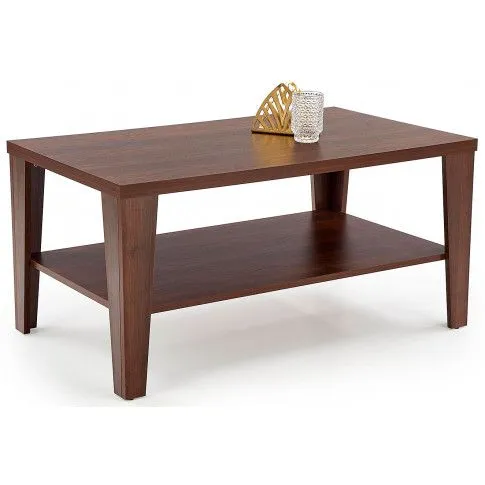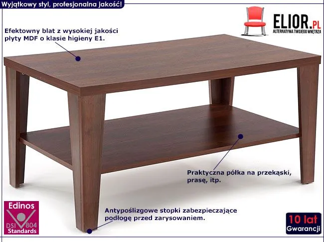 Oryginalna w formie konstrukcja ławy w kolorze ciemny orzech wyprodukowana została z najwyższej jakości laminowanej płyty meblowej o klasie higieny E1 uszlachetnionej cienkimi filmami melaminowymi. Posiada także specjalne włókna ułożone różnokierunkowo o strukturze sinusoidalnej, co zapewnia nadanie jej cech jakościowych oraz wytrzymałościowych. Zastosowana technologia sprzyja utrzymywaniu mebla w czystości. Designerski blat o grubości aż 32 mm wykonany został ze specjalnej płyty komórkowej, której główną zaletą jest redukcja ciężaru bez utraty stabilności oraz innych funkcji konstrukcyjnych.