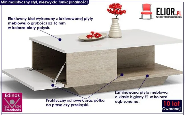 Przedstawiamy Ci zachwycający stolik kawowy Noka z kolekcji Martis marki Elior. To doskonała propozycja dla osób ceniących piękno w swoim wnętrzu. Użyta do produkcji blatu oraz drzwiczek schowka lakierowana płyta meblowa w kolorze biały połysk została uszlachetniona cienkimi filmami melaminowymi. Posiada także specjalne włókna ułożone różnokierunkowo o strukturze sinusoidalnej, co zapewnia nadanie jej cech jakościowych oraz wytrzymałościowych. Zastosowana technologia sprzyja utrzymywaniu mebla w czystości. Korpus mebla w kolorze dąb sonoma wyprodukowano z płyty laminowanej o podwyższonej trwałości i gęstości. Zamykany schowek oraz półka na prasę czy przekąski są niezwykle praktyczne i pomagają Ci zaoszczędzić miejsce na blacie głównym, a także utrzymać na nim porządek. Stonowana kolorystyka i prosta forma sprawiają, że stolik Noka doskonale sprawdza się we wnętrzach urządzonych w stylu skandynawskim, jak też minimalistycznym czy nowoczesnym. Świetnie nadaje się także do wnętrz dziecięcych czy młodzieżowych. Stwórz w swoim domu niepowtarzalny i ciepły klimat z ławą marki Elior!