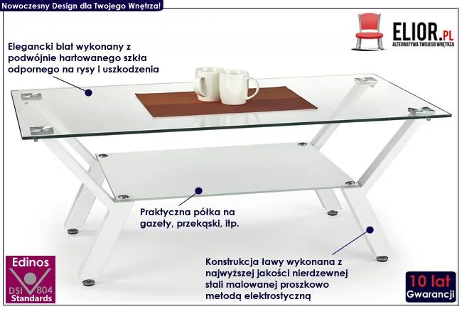 Szukasz sposobu na odmianę Twojego wnętrza? Chcesz wprowadzić do niego wyjątkowo przyjemny klimat? Z przyjemnością przedstawiamy Ci stolik kawowy George marki Elior. Firma Elior charakteryzuje się wyrazistym designem i dbałością o każdy szczegół mebla, a wdzięk i styl, jak również mocna i stabilna konstrukcja, to cechy najnowszej ławy George. Jej niepowtarzalny urok urzeknie Cię od pierwszego wejrzenia.