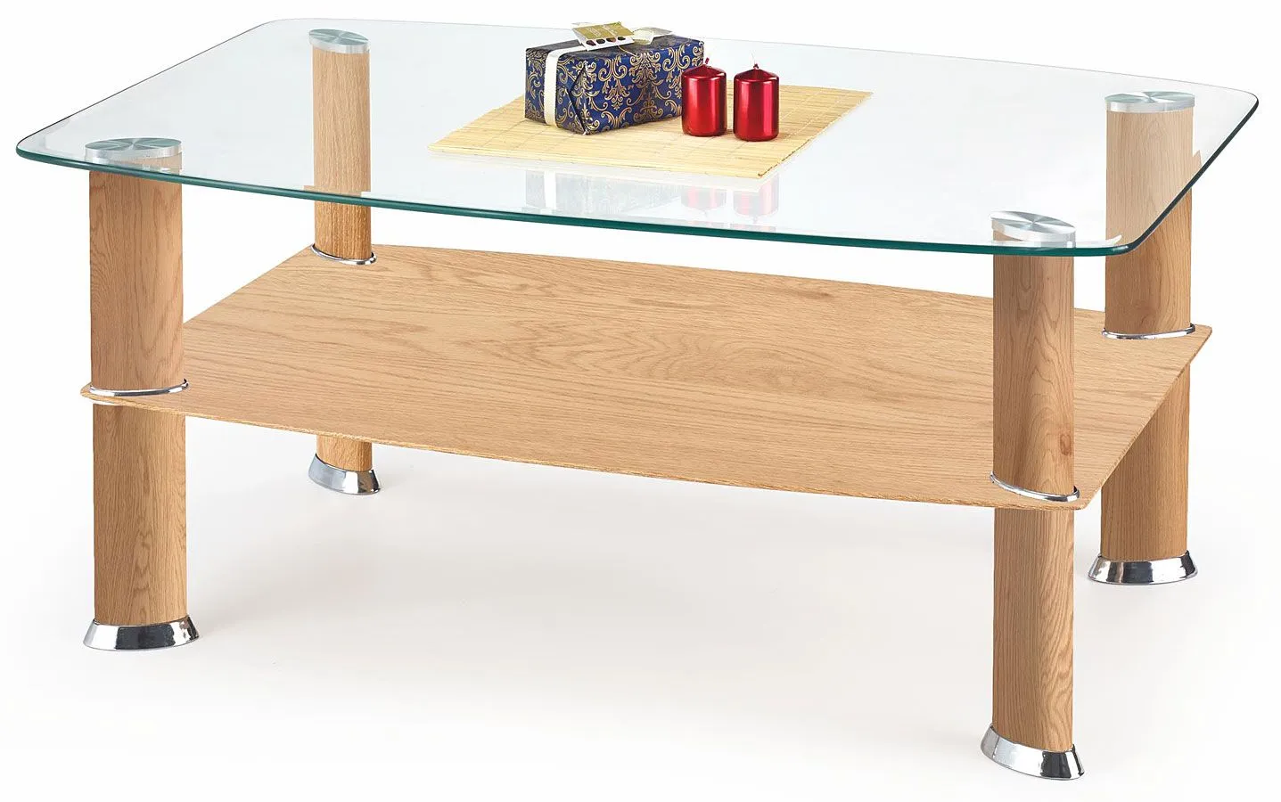 Komfortowa i wykwintna ława Naxin wyróżnia się nie tylko swoją praktyczną formą i eleganckim kształtem, ale także zastosowaniem materiałów najlepszej jakości. To dlatego cieszy się ona powodzeniem wśród osób lubiących nowatorskie rozwiązania. Użyta do produkcji stolika płyta laminowana w kolorze dąb złoty została uszlachetniona cienkimi filmami melaminowymi. Posiada także specjalne włókna ułożone różnokierunkowo, co zapewnia nadanie jej cech jakościowych oraz wytrzymałościowych. Designerski prostokątny blat zrobiono z podwójnie hartowanego szkła, dzięki czemu jest całkowicie odporny na rysy i uszkodzenia. Praktyczna półka na niezbędne drobiazgi pomaga Ci zaoszczędzić miejsce na blacie i utrzymać na nim porządek. Ława Naxin dodaje wnętrzu harmonii i elegancji, a każda kawa przy niej wypita smakuje doskonale. Podaruj Twoim czterem kątom nieco delikatnego ciepła, harmonizując je ze świeżością naturalnych barw.
