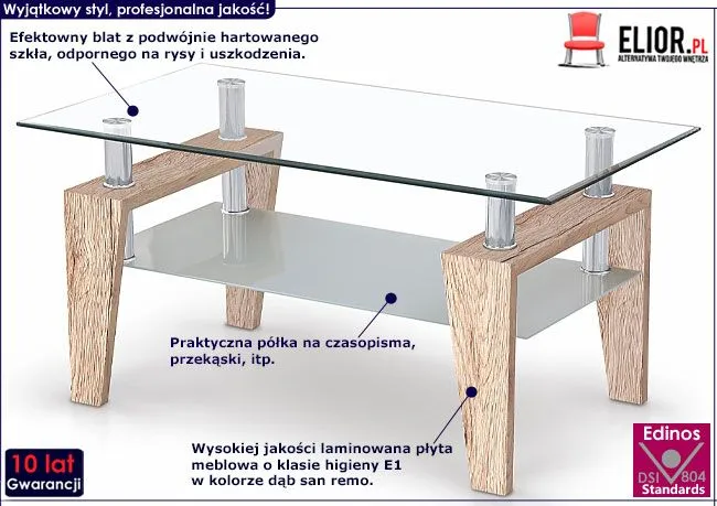 Komfortowa i wykwintna ława Lofter wyróżnia się nie tylko swoją praktyczną formą i eleganckim kształtem, ale także zastosowaniem materiałów najlepszej jakości. To dlatego cieszy się ona powodzeniem wśród osób wybierających profesjonalne rozwiązania. Użyta do produkcji stolika płyta laminowana w kolorze dąb san remo została uszlachetniona cienkimi filmami melaminowymi. Posiada także specjalne włókna ułożone różnokierunkowo, co zapewnia nadanie jej cech jakościowych oraz wytrzymałościowych. Designerski prostokątny blat zrobiono z podwójnie hartowanego szkła, dzięki czemu jest całkowicie odporny na rysy i uszkodzenia. Praktyczna szklana półka na niezbędne drobiazgi pomaga Ci zaoszczędzić miejsce na blacie i utrzymać na nim porządek. Ława Lofter dodaje wnętrzu harmonii i elegancji, a każda kawa przy niej wypita smakuje doskonale. Podaruj Twoim czterem kątom nieco delikatnego ciepła, harmonizując je ze świeżością naturalnych barw.