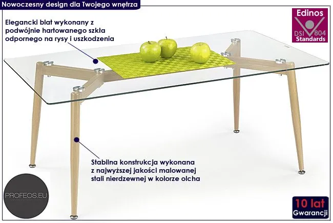 - Kolor: blat bezbarwny, nogi w kolorze olcha.