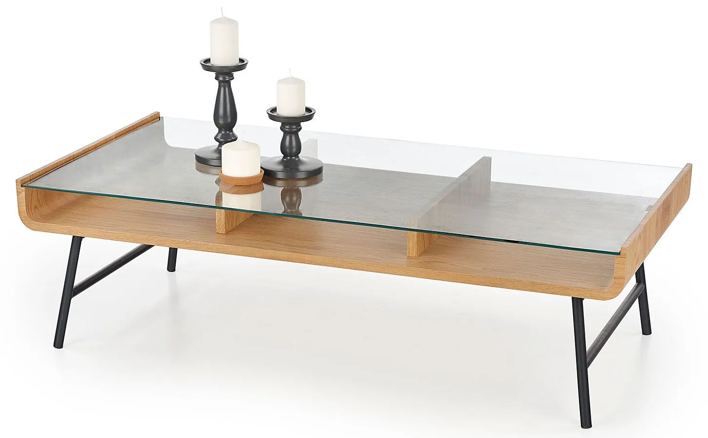 Wykonana z laminowanej płyty meblowej, ława utrzymana jest w jasnym kolorze złoty dąb, który nie przytłacza pomieszczenia, prezentuje się świeżo i lekko. Opływowy kształt dna ławy nadaje jej subtelnego charakteru, a szklany blat dopełnia całość, kreując wrażenie luksusu. Szkło hartowane jest odporne na wszelkie rysy, zadrapania i uszkodzenia, powstające podczas codziennej eksploatacji mebla. Ława stoi na niewysokich nóżkach stalowych, które dla zmaksymalizowania odporności na uszkodzenia zostały pomalowane proszkowo metodą elektrostatyczną.