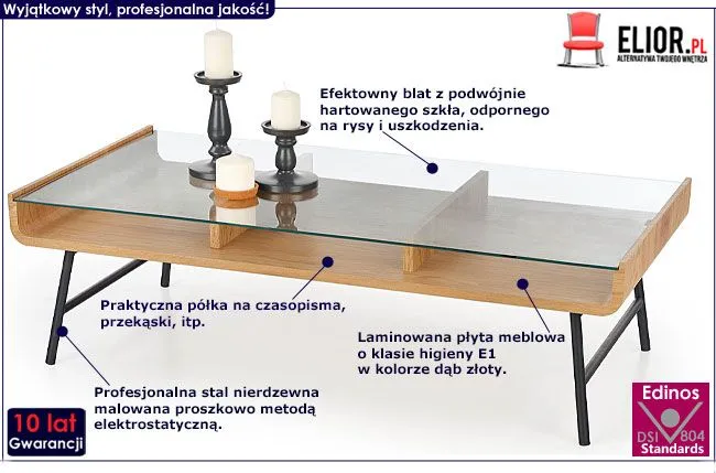 Kolor: Blat przezroczysty, półka w kolorze złoty dąb, konstrukcja czarna. Kliknij w link i sprawdź także inne prostokątne ławy w sklepie Edinos.pl. Stwórz swój praktyczny zestaw mebli.