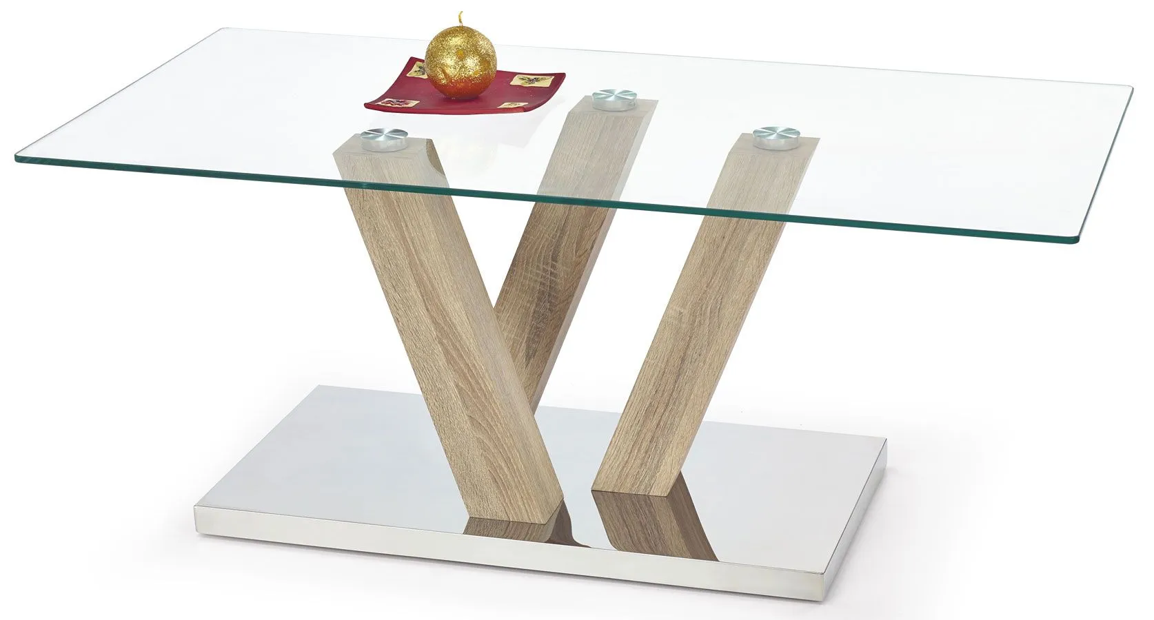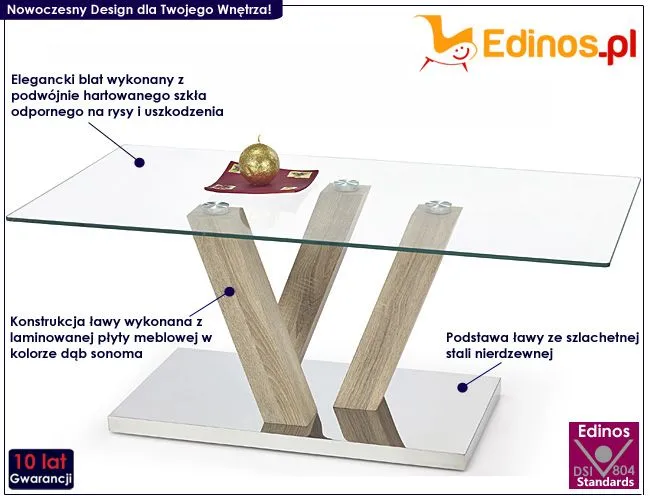 Komfortowa i wykwintna ława Amonti wyróżnia się nie tylko swoją praktyczną formą i eleganckim kształtem, ale także zastosowaniem materiałów najlepszej jakości. To dlatego cieszy się ona powodzeniem wśród osób lubiących nowatorskie rozwiązania. Użyta do produkcji mebla płyta laminowana w kolorze dąb sonoma została uszlachetniona cienkimi filmami melaminowymi. Posiada także specjalne włókna ułożone różnokierunkowo, co zapewnia nadanie jej cech jakościowych oraz wytrzymałościowych. Podstawa stolika wyprodukowana została z wysokiej jakości stali nierdzewnej, co gwarantuje jej trwałość i niepodatność na uszkodzenia. Designerski prostokątny blat wykonano z podwójnie hartowanego szkła, dzięki czemu jest całkowicie odporny na zarysowania. Ława Amonti dodaje wnętrzu harmonii i elegancji, a każda kawa przy niej wypita smakuje doskonale. Podaruj Twoim czterem kątom nieco naturalnego ciepła, harmonizując je z czystością kolorów ziemi.